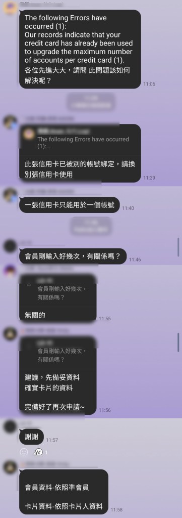A:此張信用卡已被別的帳號綁定,請換別張信用卡使用,一張信用卡只能用於一個帳號