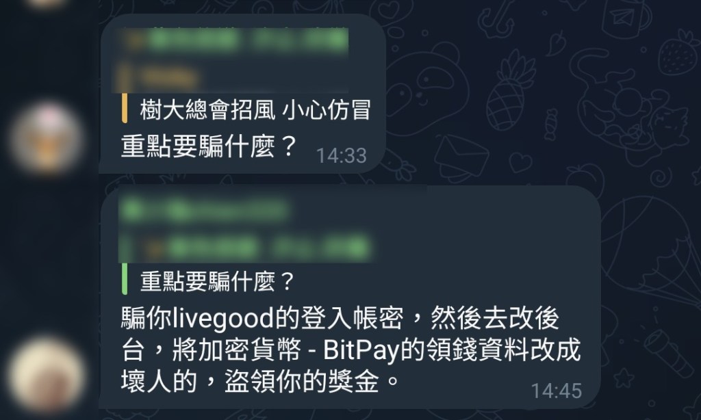 A:騙你livegood的登入帳密,然後去改後台,將加密貨幣 – BitPay的領錢資料改成壞人的,盜領你的獎金。