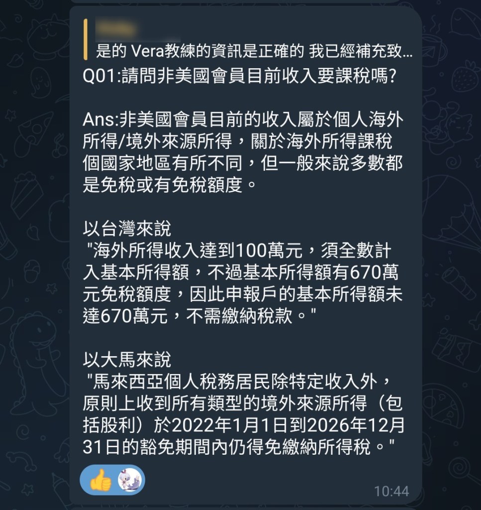 A:目前還沒落地的國家 當地會員無須報稅 因為屬於境外收入 未來落地之後 則須依據當地國家法律依法課稅