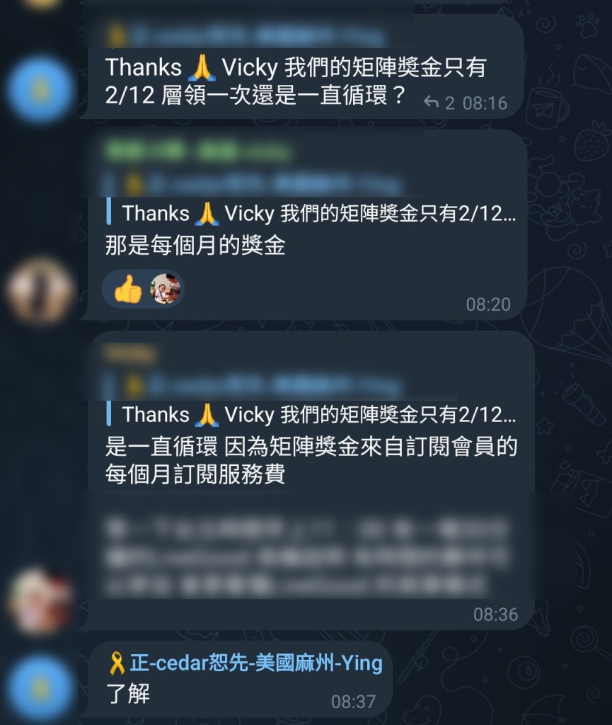 A:每個月都有、一直循環,因為矩陣獎金來自訂閱會員的每個月訂閱服務費
