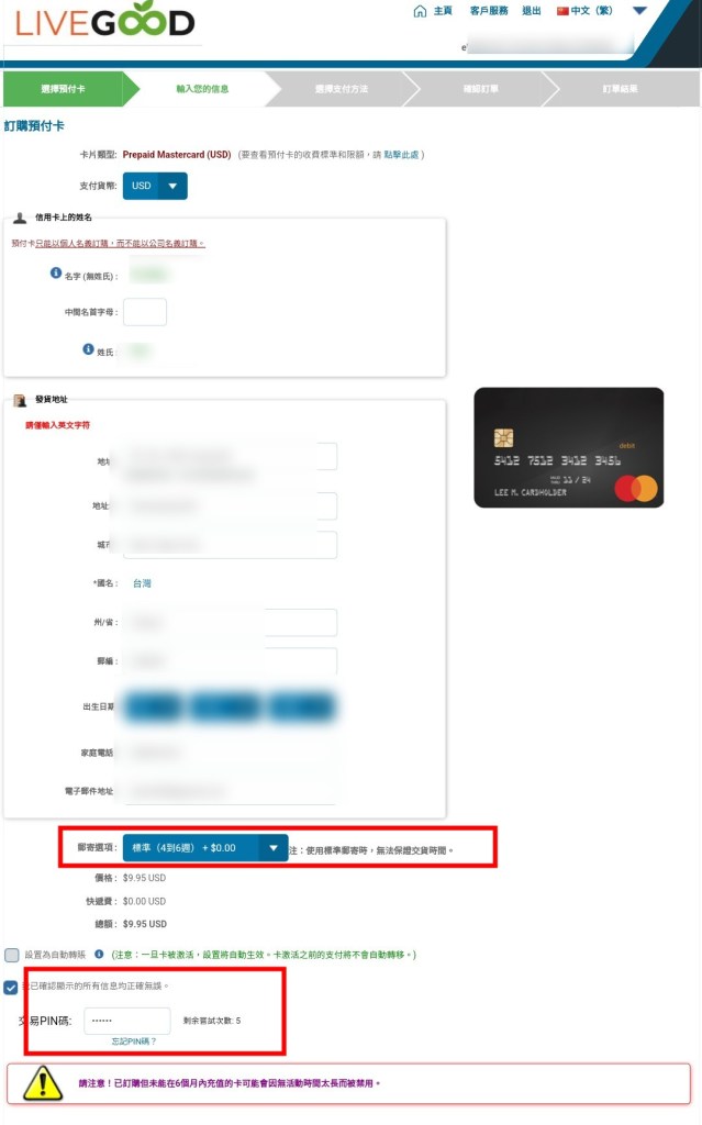選擇標準(免運)、只勾選我已確認顯示的所有信息均正確無誤、PIN碼(最多能錯5次)