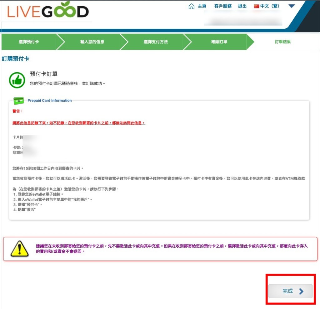 在未收到郵寄給您的預付卡之前,先不要激活此卡或向其中充值