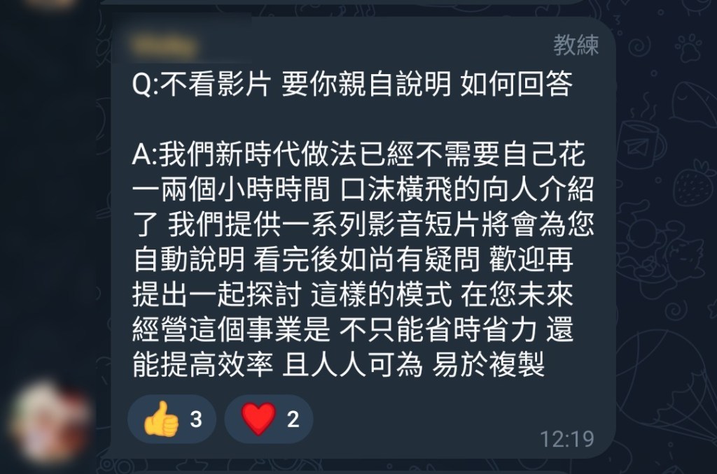 A:我們新時代做法已經不需要自己花一兩個小時時間 口沫橫飛的向人介紹了 我們提供一系列影音短片將會為您自動說明 看完後如尚有疑問 歡迎再提出一起探討 這樣的模式 在您未來經營這個事業是 不只能省時省力 還能提高效率 且人人可為 易於複製