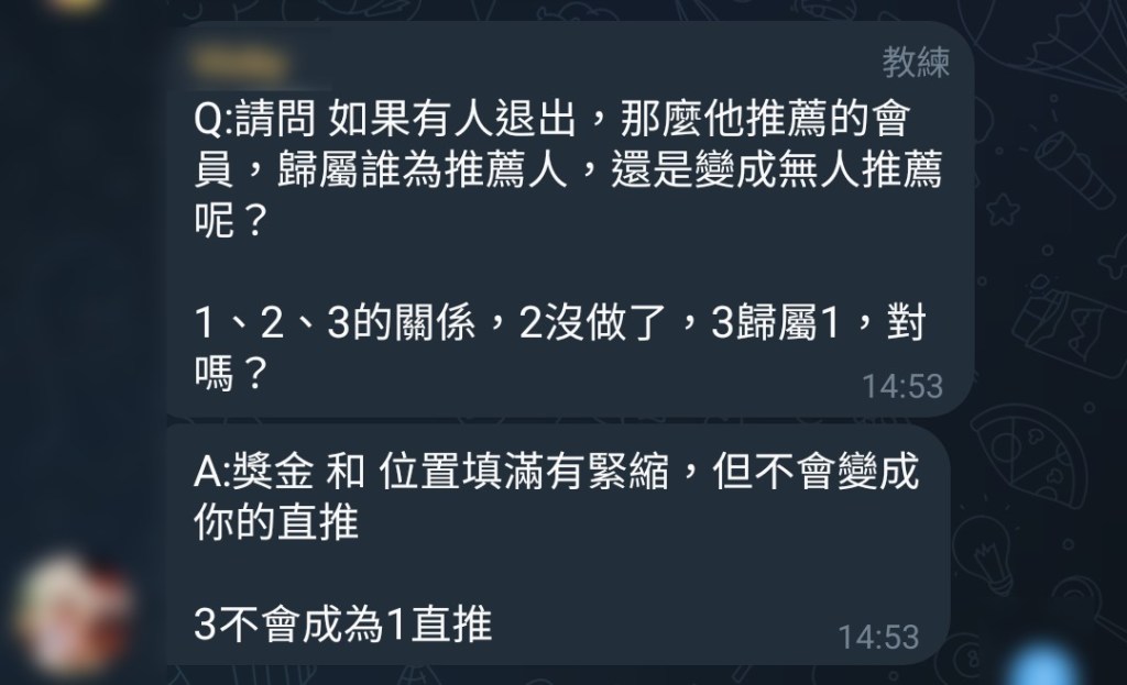 Q:請問 如果有人退出,那麼他推薦的會員,歸屬誰為推薦人,還是變成無人推薦呢?