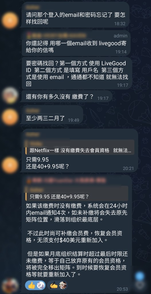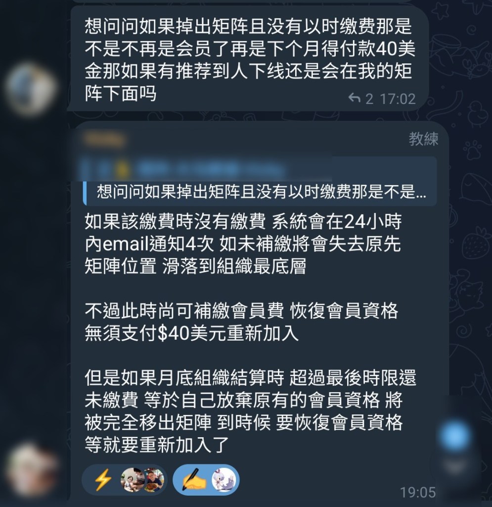 Q:想問問如果掉出矩陣且沒有按時繳費那是不是不再是會員了?下個月得付款40美金那如果有推薦到人下線還是會在我的矩陣下面嗎?