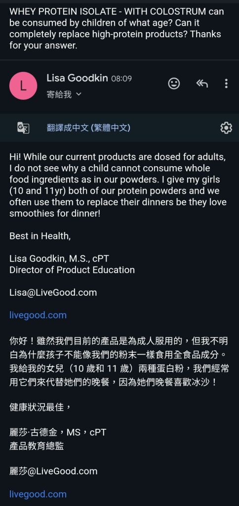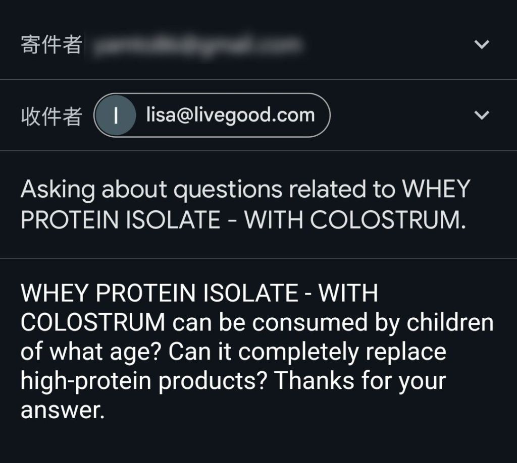 主旨:詢問WHEY PROTEIN ISOLATE – WITH COLOSTRUM相關問題