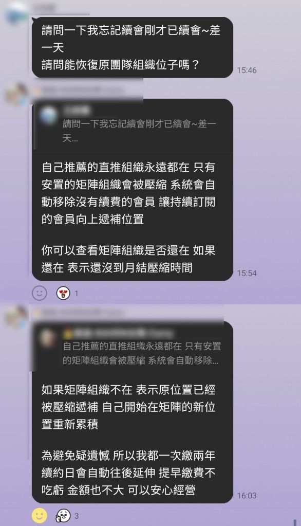 A:自己推薦的直推組織永遠都在 只有安置的矩陣組織會被壓縮 系統會自動移除沒有續費的會員 讓持續訂閱的會員向上遞補位置