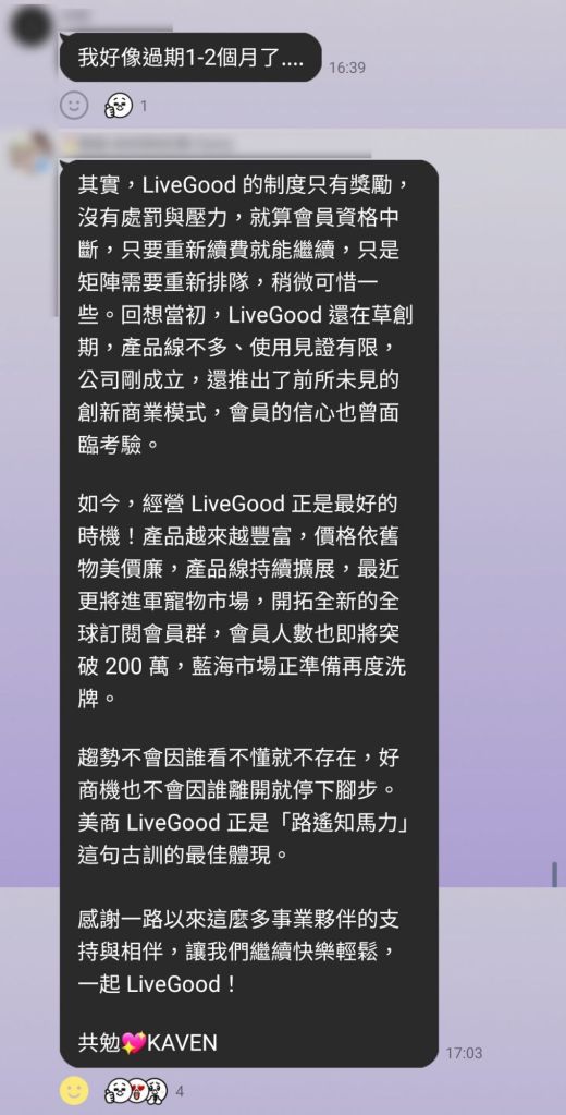 LiveGood 不是傳統直銷 比較像Costco會員很自由 現在產品 比一年多前多了一倍 可以請他續約 順便把錢領出 或去買產品用用看